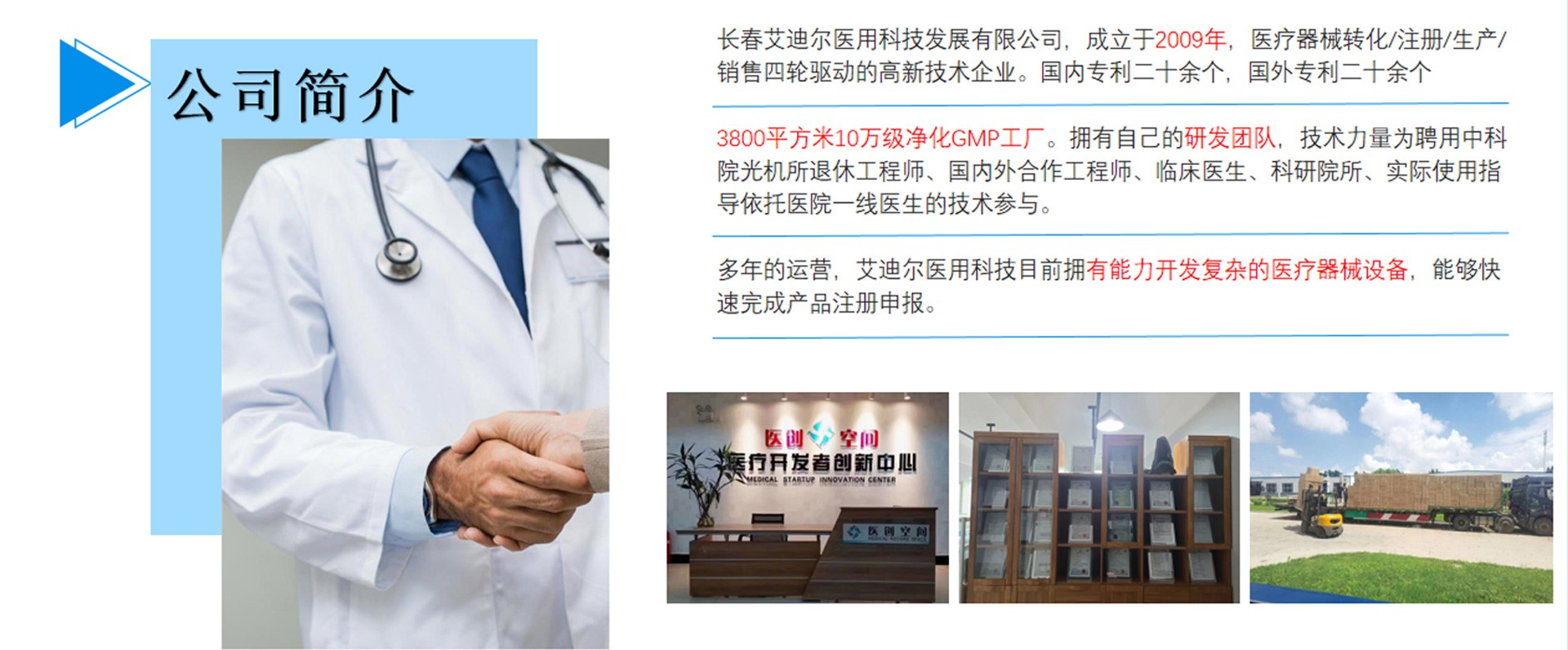 長春艾迪爾醫(yī)用科技發(fā)展有限公司為集產(chǎn)(自有工廠); 學(xué)(多所院校科研課題合作單位);研(研發(fā)成果轉(zhuǎn)化注冊(cè))三位一體的高新技術(shù)企業(yè)。艾迪爾科技主要經(jīng)營范圍為一次性醫(yī)療器械耗材的開發(fā),專注于抗菌肽新材料的開發(fā)和研制,以“IN-58抗菌肽一類新藥及原料藥注冊(cè)、激光類治療儀”兩個(gè)核心優(yōu)勢(shì)技術(shù)為中心。公司擁有標(biāo)準(zhǔn)GMP車間及健全的質(zhì)量管理體系,擁有多個(gè)已上市和即將上市的產(chǎn)品,包括睡眠、泌尿、口腔、肝膽、消殺、婦科六大系列產(chǎn)品線。公司擁有核心專業(yè)技術(shù)報(bào)批團(tuán)隊(duì),承接國內(nèi)外醫(yī)療器械專項(xiàng)成果轉(zhuǎn)化,具備自主研發(fā)能力及MAH服務(wù)能力。